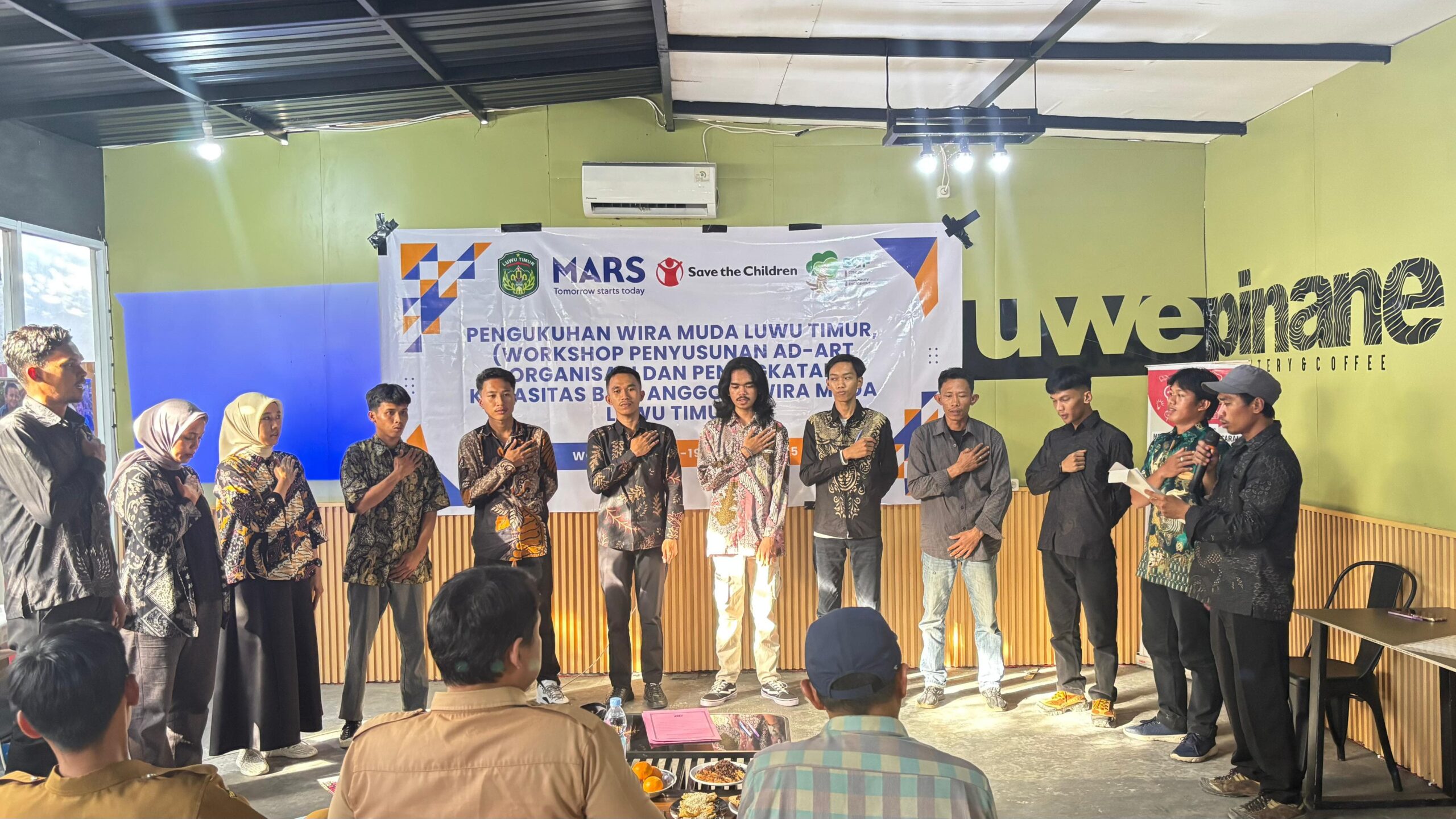 Kegiatan workshop dan pengukuhan pengurus organisasi Wira Muda Luwu Timur ditutup dengan penandatanganan berita acara pengukuhan yang dilakukan oleh perwakilan Pemerintah Daerah, Mars, Save the Children dan semua anggota organisasi. (WJI)