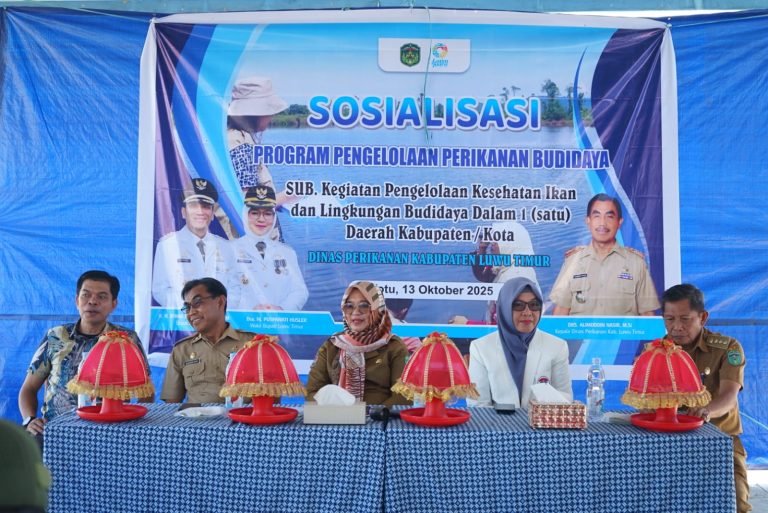 Luwu Timur, Chaneltipikor.com – Pemerintah Kabupaten Luwu Timur melalui Dinas Perikanan melakukan Sosialisasi Program Pengelolaan Perikanan Budidaya dan Pemberdayaan Petani Pembudidaya Ikan yang berlangsung di Bangsal TPI Wotu, Senin (13/10/2025).