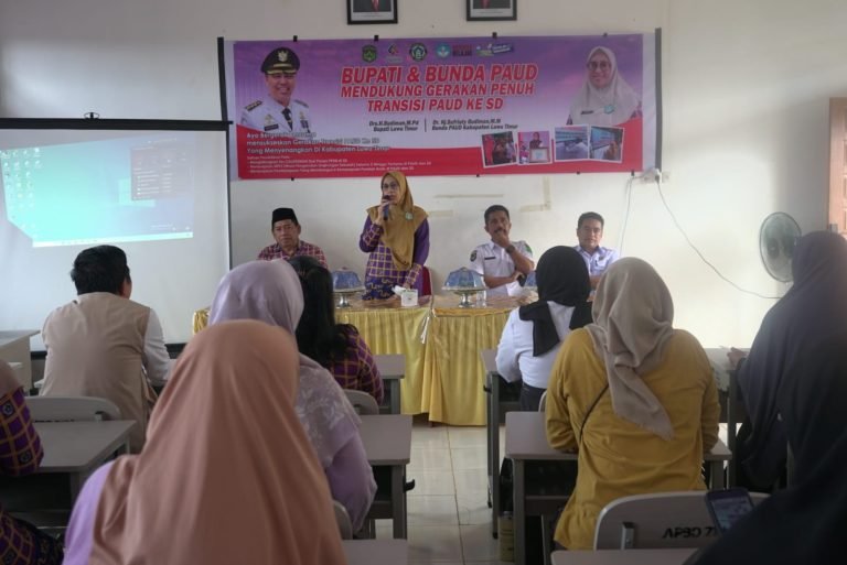 Luwu Timur, Chaneltipikor.com – Bunda Paud Kabupaten Luwu Timur, Hj. Sufriaty Budiman didampingi Kepala Dinas Pendidikan dan Kebudayaan, Muhammad Syukri membuka secara resmi Kegiatan Sosialisasi Gerakan Transisi PAUD ke SD yang Menyenangkan yang diikuti sebanyak 80 Guru Paud dan SD dari Kecamatan Malili dan Angkona dilaksanakan di SDN 238 Mallaulu Malili, Rabu (29/5/2024).