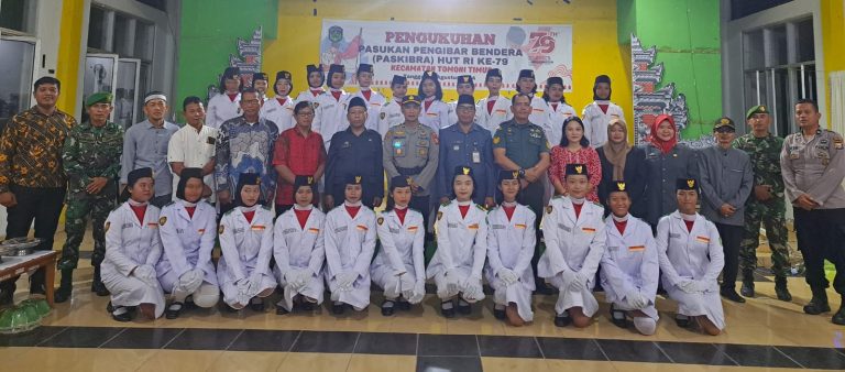 Luwu Timur, Chaneltipikor.com – Sebanyak 56 anggota Pasukan Pengibar Bendera (Paskibra) yang akan bertugas pada upacara peringatan Hari Ulang Tahun (HUT) ke-79 Proklamasi Kemerdekaan Republik Indonesia tingkat Kecamatan Tomoni Timur resmi dikukuhkan oleh Camat Tomoni Timur, Yulius, pada Kamis (15/8/2024) malam.