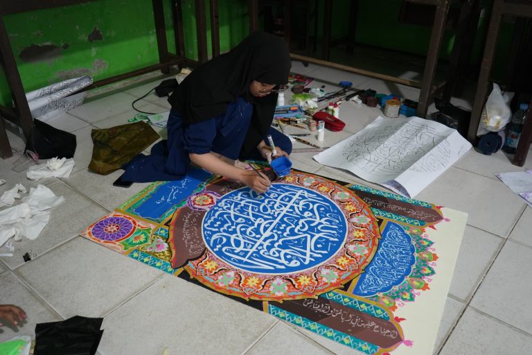 Para peserta menuangkan kemampuan dan kreativitasnya melalui goresan kuas dengan perpaduan beragam warna, serta menggunakan media alas berbahan triplex, sehingga menghasilkan karya kaligrafi yang artistik dan memiliki nilai estetika tinggi.