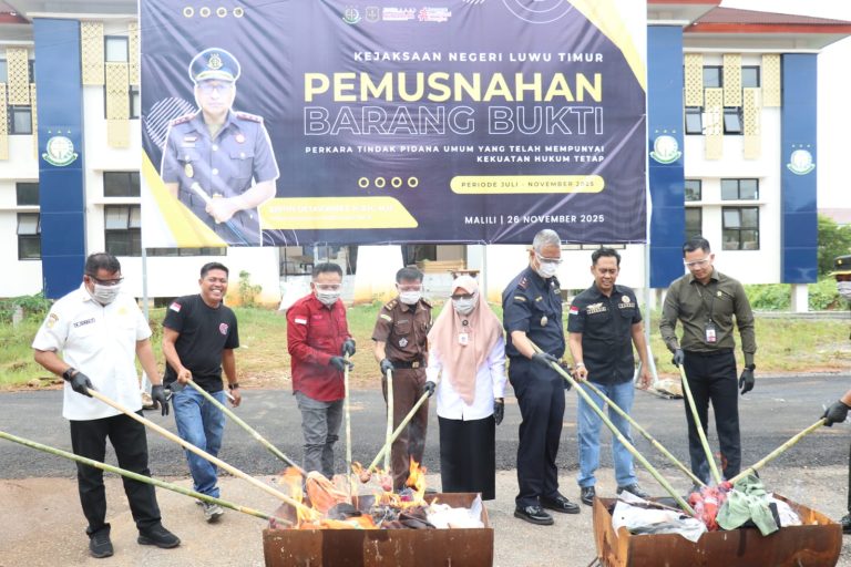 Luwu Timur, Chaneltipikor.com – Kejaksaan Negeri Luwu Timur (Lutim) kembali menggelar pemusnahan barang bukti yang telah berkekuatan hukum tetap dengan amar putusan dirampas untuk dimusnahkan periode Juli hingga November 2025, di halaman kantor Kejaksaan Negeri Lutim, Rabu (26/11/2025).