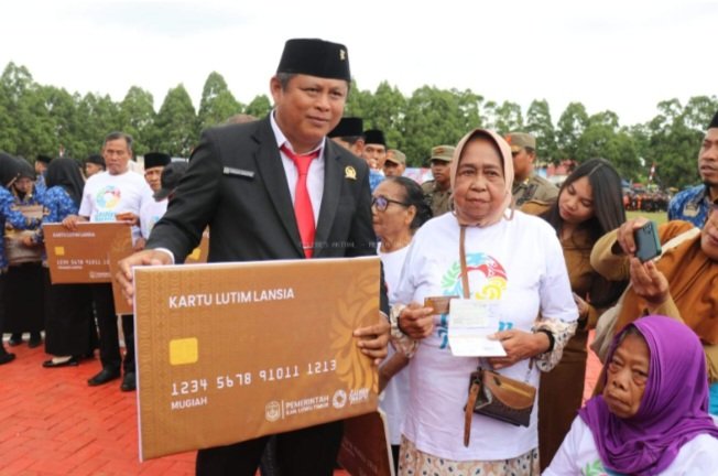 Ketua DPRD Luwu Timur, Ober Datte menyerahkan secara simbolis Kartu Lutim Lansia kepada perwakilan lansia dari 11 Kecamatan se-Kabupaten Luwu Timur usai upacara peringatan Hari Kemerdekaan Republik Indonesia (RI) di Lapangan Pendidikan Malili, Minggu (17/8/2025).
