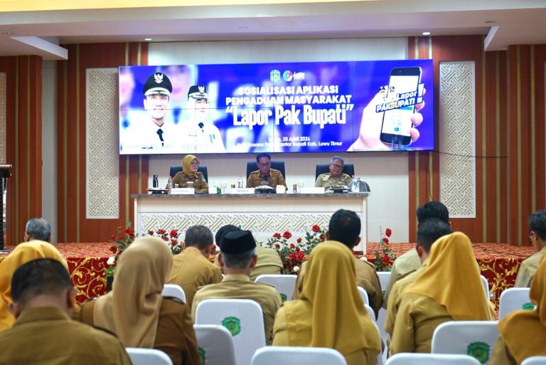 Luwu Timur, Chaneltipikor.com – Dinas Komunikasi, Informatika, Statistik dan Persandian (Kominfo-SP) Kabupaten Luwu Timur melalui Bidang Aplikasi dan Informatika menggelar sosialisasi aplikasi panduan masyarakat “Lapor Pak Bupati” di Aula Sasana Praja, Kantor Bupati Luwu Timur, Senin (20/4/2026).