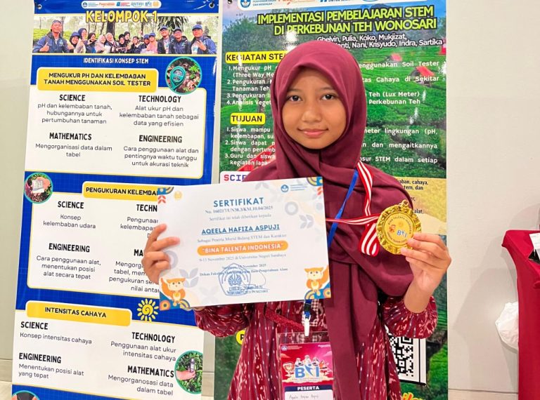 Luwu Timur, Chaneltipikor.com – Prestasi membanggakan kembali ditorehkan oleh Aqeela Hafiza Aspuji murid kelas IX dari UPT SMPN 2 Malili, Kabupaten Luwu Timur, setelah berhasil meraih predikat penyaji terbaik protipe kategori murid pada kegiatan Bina Talenta Indonesia yang diselenggarakan di Universitas Negeri Surabaya (UNESA) Senin (10/11/2025).