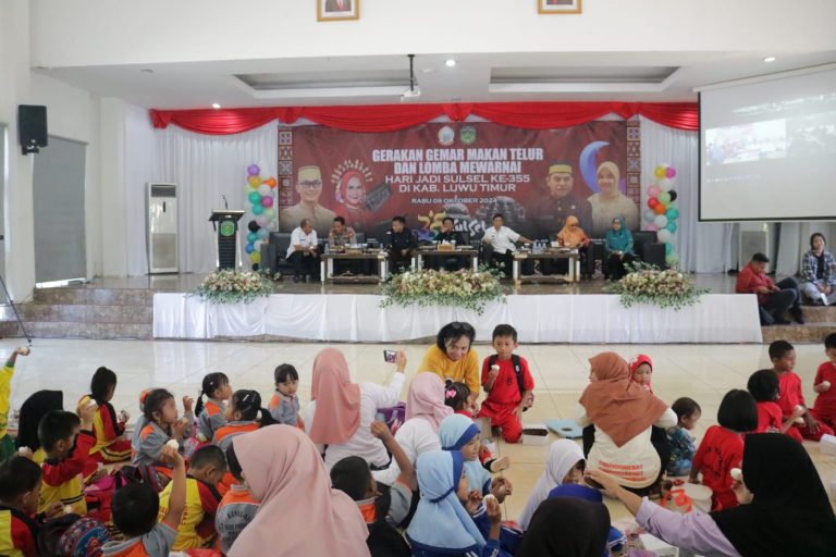 Luwu Timur, Chaneltipikor.com – Dalam rangka memeriahkan Hari Jadi Provinsi Sulawesi Selatan yang ke-355 Tahun, maka Pemerintah Kabupaten Luwu Timur, melalui Dinas Sosial Pemberdayaan Perempuan dan Perlindungan Anak, menggelar kegiatan Gerakan Gemar Makan Telur serentak dan Lomba Mewarnai Bagi Anak dari Keluarga Data Terpadu Kesehjateraan Sosial (DTKS), di Gedung Wanita Simpurusiang Malili, Rabu (9/10/2024).