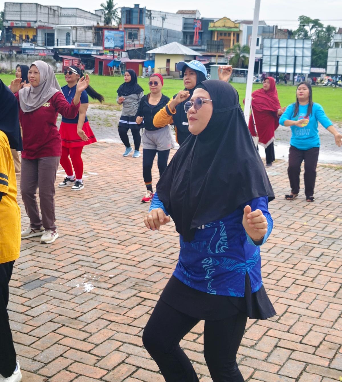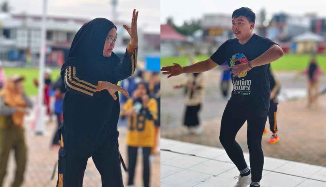 Instruktur kembali memimpin gerakan dengan irama yang penuh semangat, membuat peserta larut dalam suasana kebugaran dan keceriaan. Gelak tawa dan sorak sorai terdengar sepanjang sesi senam berlangsung.