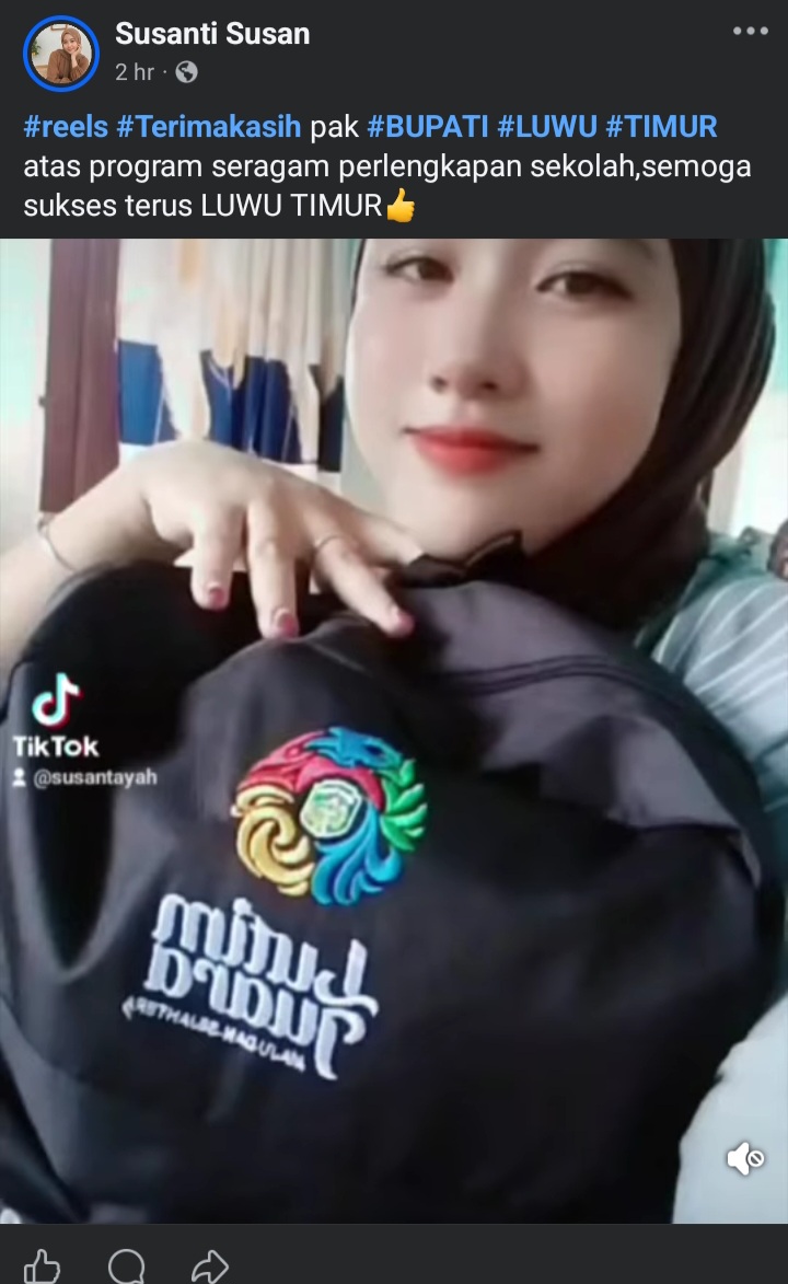 Hal yang senada juga diunggah oleh akun Facebook Susanti Susan yang menuliskan “Terimakasih pak BUPATI LUWU TIMUR atas program seragam perlengkapan sekolah, semoga sukses terus LUWU TIMUR.”