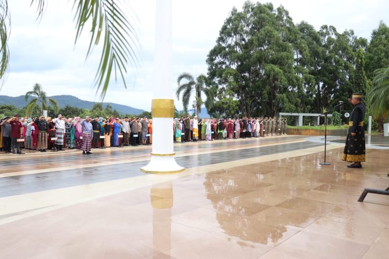 Upacara yang berlangsung khidmat ini dipimpin oleh Sekretaris Daerah Lutim, H. Bahri Suli, yang tampil mengenakan pakaian adat Nusantara, seirama dengan seluruh peserta upacara dari kalangan pejabat eselon II, III, IV, ASN, hingga tenaga upah jasa.