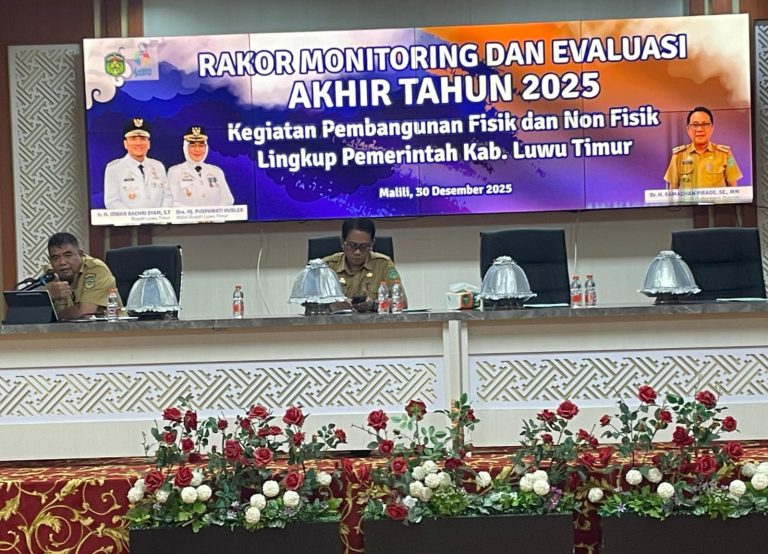 Luwu Timur, Chaneltipikor.com – Pemerintah Kabupaten Luwu Timur melalui Bagian Perekonomian dan Administrasi Pembangunan Sekretariat Daerah menggelar Rapat Koordinasi (Rakor) Monitoring dan Evaluasi (Monev) Akhir Tahun 2025 terhadap kegiatan fisik dan non fisik lingkup Pemkab Luwu Timur, di Aula Sasana Praja Kantor Bupati, Selasa (30/12/2025).