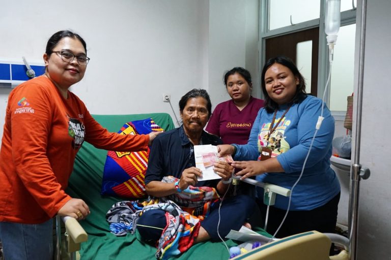 Dengan tangan yang masih terpasang infus, ia tetap berusaha menandatangani berkas-berkas yang diberikan oleh tim sebagai tanda penerimaan bantuan Kartu Lansia tersebut.