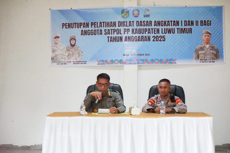 Luwu Timur, Chaneltipikor.com – Plt. Kepala Satuan Polisi Pamong Praja, Baharuddin, S.Pd.,M.Si mewakili Bupati Luwu Timur secara resmi menutup kegiatan Pendidikan Dasar (Diksar) Satuan Polisi Pamong Praja (Satpol PP) Lutim, Ahad (14/12/2025), yang berlangsung di Hotel Sikumbang, Kecamatan Tomoni.