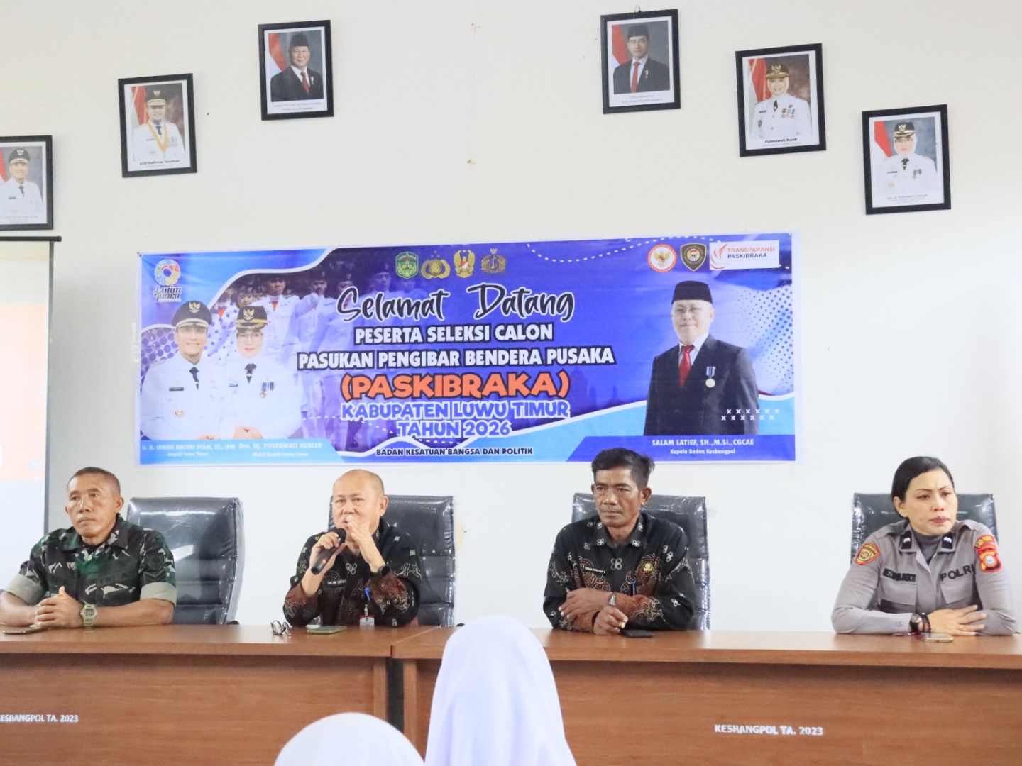 Luwu Timur, Chaneltipikor.com – Pemerintah Kabupaten Luwu Timur melalui Badan Kesatuan Bangsa dan Politik (Kesbangpol) menggelar tahapan seleksi Calon Pasukan Pengibar Bendera Pusaka (Paskibraka) tingkat Kabupaten Luwu Timur Tahun 2026. Kegiatan ini merupakan bagian dari persiapan pasukan pengibar bendera pada peringatan 17 Agustus 2026, dan berlangsung di Aula Kesbangpol Luwu Timur, Kamis (02/04/2026).