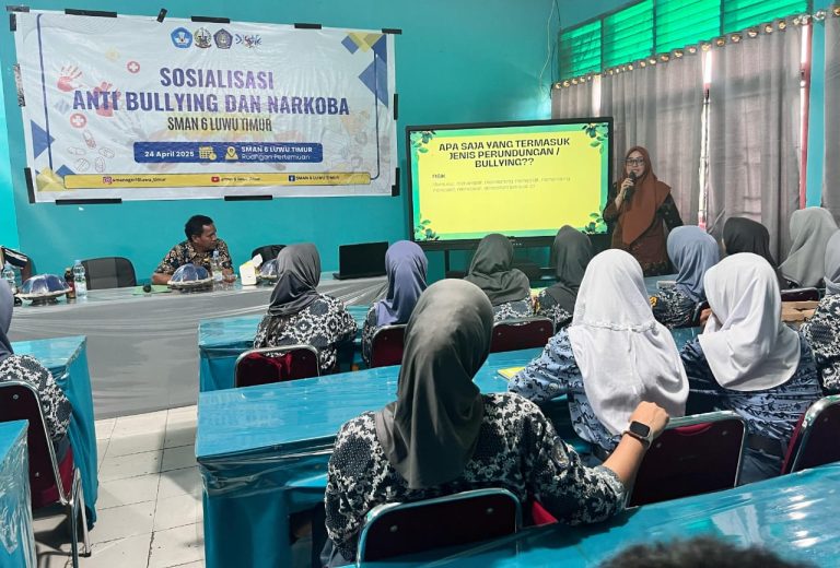 Luwu Timur, Chaneltipikor.com – UPT SMAN 6 Kabupaten Luwu Timur (Lutim) gandeng Dinas Sosial Pemberdayaan Perempuan dan Perlindungan Anak (Dinsos P3A) Lutim dalam rangka kegiatan Sosialisasi Anti Bullying dan Narkoba.